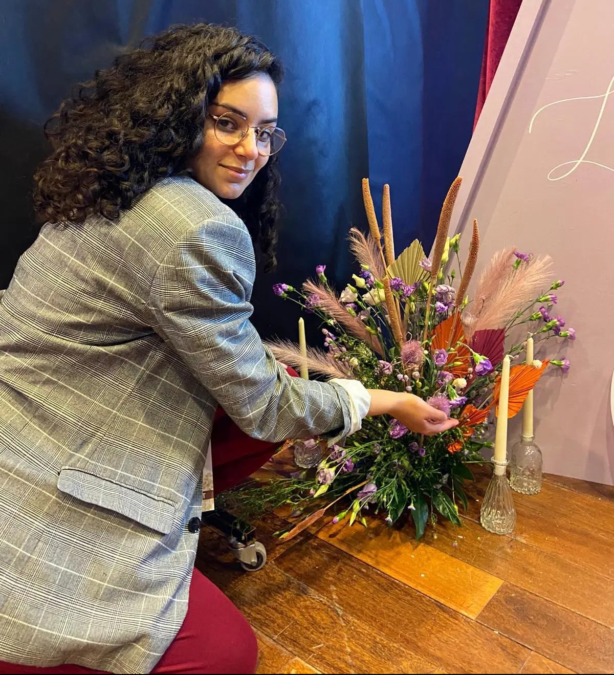 Des compositions florales colorées pour cette décoration qui peut être un espace photo (panneaux triangulaires) pour un mariage en collaboration avec EA Event Planner.
